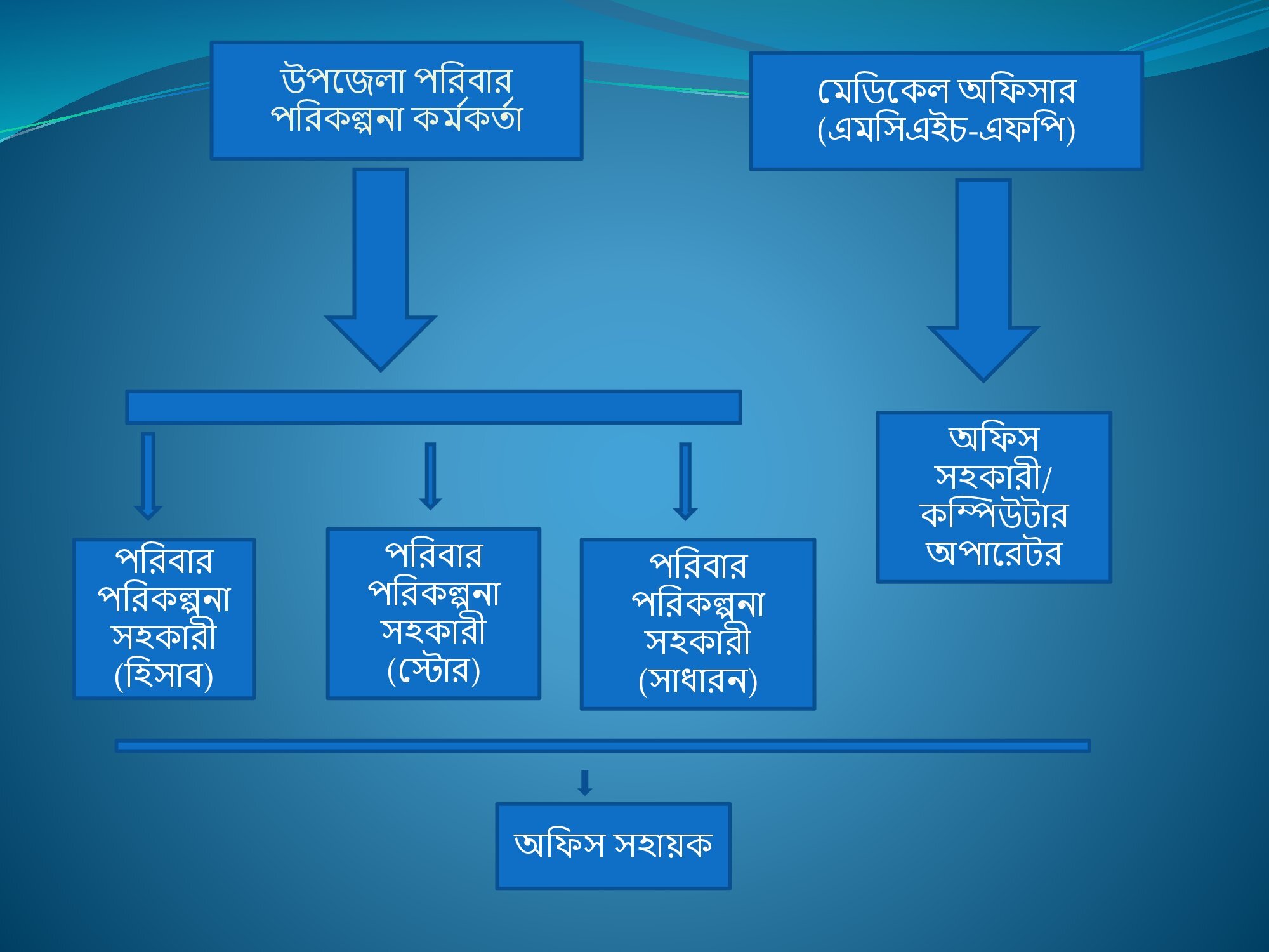 উপজেলা পরিবার পরিকল্পনা কার্যালয়ে ০১ জন পরিবার পরিকল্পনা কর্মকর্তা এবং ০১ জন মেডিকেল অফিসার (এমসিএইচ-এফপি) কর্মকর্তা হিসেবে আছেন। কর্মকর্তাদের অধীনে উপজেলা অফিসে ০৩ জন পরিবার পরিকল্পনা সহকারী এবং ০১ জন অফিস সহায়ক কর্মরত আছেন। এছাড়াও মাঠ পর্যায়ে ০৪ জন উপসহকারী কমিউনিটি মেডিকেল অফিসার, ০৯ জন পরিবার কল্যাণ পরিদর্শিকা, ০২ জন ফার্মাসিষ্ট, ১১ জন পরিবার পরিকল্পনা পরিদর্শক, ৪৮ জন পরিবার কল্যাণ সহকারী, ০২ জন সহকারী নার্সিং এ্যটেন্ডেন্ট , ০৮ জন এমএলএসএস/নি: প্রহরী এবং ০৮ জন আয়া কর্মরত রয়েছেন।