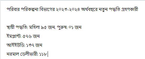 পরিবার পরিকল্পনা বিভাগের ২০২৩-২০২৪ অর্থবছরে নতুন পদ্ধতি গ্রহণকারী